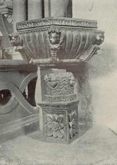 Ez utóbbi később vörösre mázolt sárgás homokkőből készült; négyszögletes lábán lenn négyszögletekbe foglalt stilizált rózsák ; a láb hatszögletes felső részén kerub-fejek díszítik, a minőket csigás gyámkövek fölött, a hólyagos díszű, szögletes medence sarkain is láthatunk. A medence felső peremén ez a nagybetűs felirat olvasható : In laudem gloriosi Dei curavit Jacobus Wrbicki An. 1652., vagyis Isten dicsőségére Wrbicki Jakab bőkezűségéből készült.