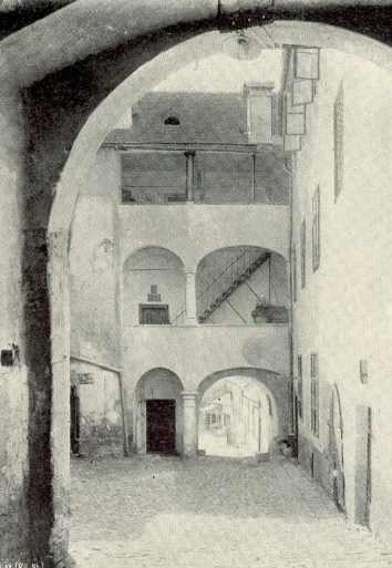 Ilyen loggiákkal, avagy gyámkövek során nyugvó formás árkádos folyosókkal Besztercebánya mellékutcáinak, néhol hihetetlenül kicsiny udvaraiban is lépten nyomon találkozunk. S a legtöbb helyen ma már csak ezek az udvarok tanúskodnak arról, hogy a ház valamikor renaissancestílű volt Hogy ebben a ma is rendkívül eleven és művelt bányavárosunkban a renaissance stílnek felsőmagyarországi változata volt általános, erre a Főtéren és a mellékutcákban egyaránt a házak legfelső emelete enged következtetést. Ezek legtöbbjén nyilvánvaló, hogy a háborús idők elmultával a tetőt védő emeletnyi magas oromfal felhasználásával építették ; sőt számos házon a legfelsőbb emeleten pusztán vakablakok vannak s az így átalakított régi oromfal mögött még ma is az eredeti félereszű tetőt láthatjuk. Ilyen átalakított oromfal van a Főtér 3. számú házának homlokzatán, amelynek udvari szárnyán festői hatású árkádos folyosó fut végig. Ez a ház szomszédos Besztercebánya főterének egyetlen, nagyobb átalakítástól homlokzatán is ment maradt épületével, melyet emeletnyi magas oromfalának attikáján egymásl metsző félkörívek frízébe foglalt lőrések törnek át.