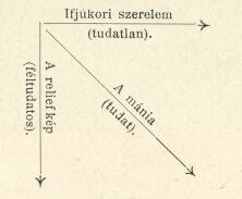 Ezek a nappali álmok sajátos szerkezetet mutatnak, így a Jensen-féle álmodozás is első pillanatra kettős értelműnek tűnik fel. Az álmodozás a körül a dolog körül forog, hogy Hanold szeretné meglelni annak a nőnek a nyomait, akit a relief ábrázol, a Gradivának. És úgy álmodja, hogy e nő Pompejiben kellett, hogy éljen. Ez az álmodozás nyilvánvaló tartalma. Azonban kiderül, hogy őt gyermekkori szerelem fűzte Zoë Bertganghoz, ez a szerelem lappangva fenmaradt benne és okozta, hogy a reliefen ábrázolt nőbe beleszeretett, aki nagyon hasonló volt Zoëhez. Azaz megfordítva volt a dolog! Nem azért szerette a reliefet, mert az ábrázolt nő szép volt, hanem azért lelkesítette oly nagyon a Gradiva járásának szépsége, mert hasonlított annak a menéséhez, akibe szerelmes volt. Itt tehát a nyilvánvaló álmodozástartalom mögött, mint determináló háttér húzódik meg a kiszorított, az elfelejtett érzelem: az ifjúkori szerelem. A manifeszt álmodozásnak tehát egész más a szószerinti tartalma és egész más az igazi értelme. Az igazi értelemről az illető nem tud, hisz ez a manifeszt álmodozás épp azért lépett fel, mert a tudattalanban egy elfelejtett, de azért hatását el nem vesztett állapot lappang, amelynek a manifeszt álmodozás mintegy szimptomája, szimbóluma. A dolgot úgy lehet képzelni, hogy valamely erős indulat (pl. Hanold ifjúkori szerelme) bizonyos elleninstanciák folytán kiszorul a tudatból, így történt, hogy Hanold teljesen elfelejtette az ifjúkori szerelmét. Ez a felejtés azonban szándékos és kiszorítás műve. Kezeügyébe kerül a relief és most egy sajátságos állapot áll elő. Ha más ember látja meg a reliefet, nem fog rá nagyobb hatást gyakorolni, mint valamely más, valóban artisztikus dolog. Hanoldot azonban elkábítja a relief, hosszú álmodozásokat folytat arról, hogy e relief modellje élt valamikor, hogy Pompéjiben élt és ott halt meg a 79-iki Vezuv-kitörés alkalmával. Honnét ez a különös hatás, ez az abnormis álmodozás? Itt kétféle képzettartalom fordul elő. Az egyik kiszorított, az ifjúkori szerelem, a másik a relief ész-revevése. E kettő bizonyos viszonyba lép: azt lehetne mondani, hogy itt két különböző erő lép komponenciába és a mániákus álmodozás ezek kompromisszumképződménye, vagy rezultánsa. Lehetne sematikusan is érzékeltetni a dolgot.