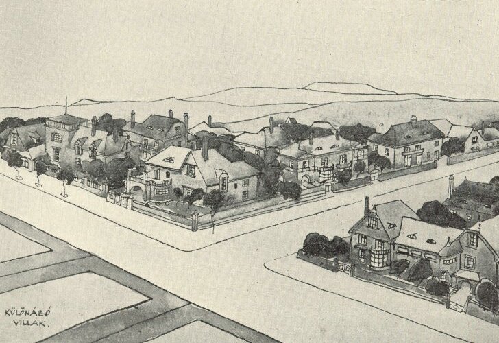 Mert beépíteni egy telket és pláne több telket együtt, ahogy az itt szerencsére mindenütt lehetséges lesz, igen sokféleképen lehet, a kertet és a házat igen sokféleképen lehet elosztani a telkeken és ez a munka döntő a városrész jövendő szépsége és praktikussága szempontjából. Hivatalos városrendezésünk háromféle beépítő móddal szokott volt dolgozni; első a zárt sor, melynél az udvar a telek belsejében szokott elhelyeződni, másik a zártsorú élő-kertes építkezés, szintén belső udvarral mindegyik házban külön, harmadik a kertes villaépítkezés, melynél a villát lehetőleg a kert közepére állítják. Már ezek a beépítési módok is, kis körültekintéssel igen különbözőképen kezelhetők. A zártsori építkezés sokat veszíthet ridegségéből, udvarai barátságosakká válhatnak, ha nagyobb telekkomplexumra közös nagy udvart állapítunk meg és azt fasi tjük, gyöpösítjük. Ez a rendszer ajánlható a Tabán legalsó részein, ott, ahol a családi ház rendszerre való áttérés túlsók pénzébe kerülne a városnak, de alkalmazni kellene a pesti bérkaszárnyanegyedekben is, mindenütt, ahol még lehetséges. Azt az anyagi veszteséget, amit az udvari szárnyak elhagyása okoz, bőven lehetne pótolni valamivel nagyobb emeletszám engedélyezésével, ami mindenesetre nem volna oly egészségtelen, mint a mostani kisudvaros bérházelrendezés, mely többek közt valósággal melegágya a tuberkulózisnak. Segíthet a zártsorú építkezésen az előudvaros elrendezés is, ha az udvarokat elég nagyra méretezzük. Ezeket a beépítéseket a körülményekhez képest sokféleképen variálhatjuk és bár higiéné szempontjából nem érik el a családi ház előnyeit, mégis nagy megjavítását jelentenék a mostani bérházrendszernek.