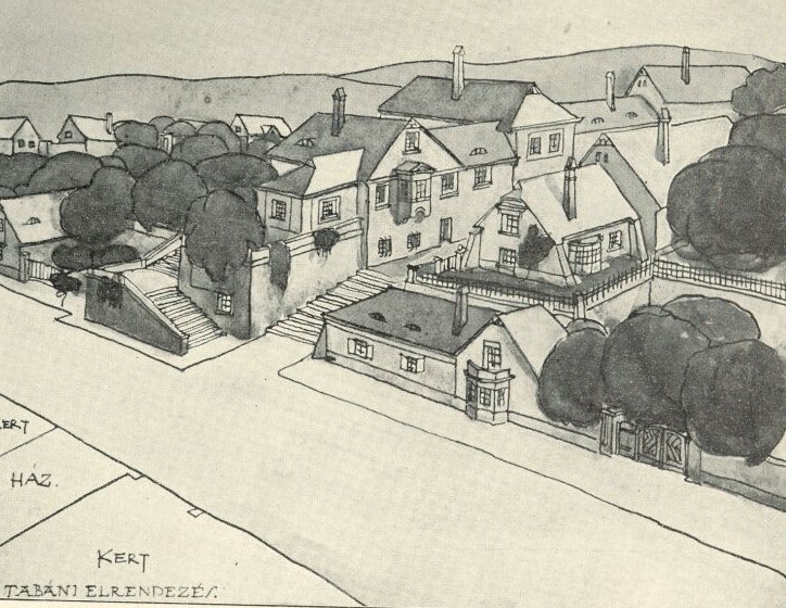 A Tabán felső részére ajánlották a villarendszert. Azt hiszem, hogy az ottani kis telkekre ez a beépítési mód igen inpraktikus és hogy sokkal jobb módokra inspirálhatnak bennünket a meglévő tabáni házak. Mit akarunk mi csinálni ? A villát a nála alig nagyobb kert közepére állítjuk. Ezáltal a kert minden irányban igen kicsi lesz, seholse lesz egy összefüggő darabban. Ezenkívül a konyha közlekedése az utcával mindig a kerten át fog lebonyolódni. Milyen evvel szemben sok tabáni ház kertelrendezése ? A kertet lehetőleg egy tagban tartják, miáltal az szebb, használhatóbb. A ház körülveszi a kertet, egyik vagy kétoldali vége kinyúlik az utcára és ott célszerűen elhelyezhető a gazdasági bejáró, amit családi házaknál igen okos dolog elkülöníteni a főbejárótól.