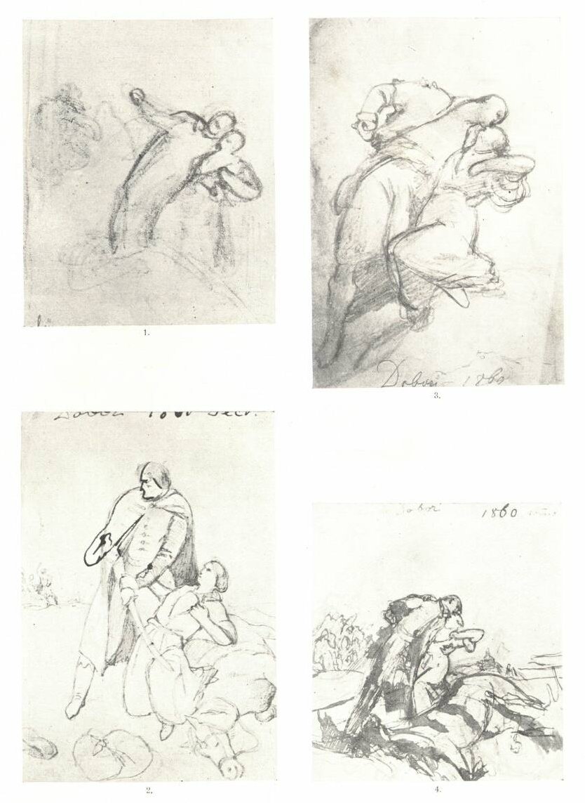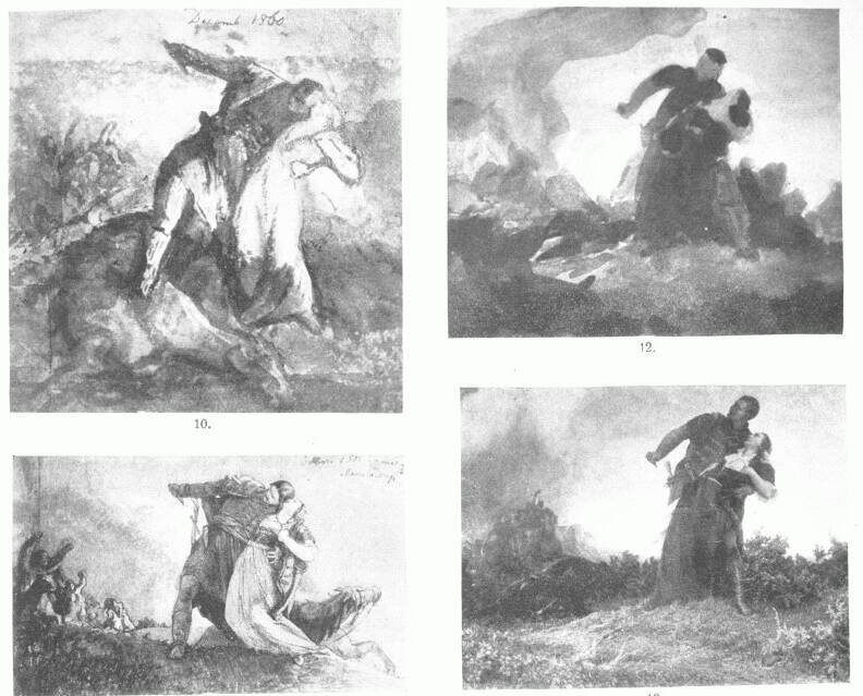 Marschendorfba megy (1861 januárjában) menyasszonyához és ott dolgozik tovább. A szenvedély vadsága elült. A drámai feszültség pillanatának ábrázolását folytatja, ahol a férfi az üldözők gyűlöletére és nem a maga fájdalmas szerelmére gondol, hátranéz az üldözőkre, mögötte a leroskadó ló, az elcsukló asszony karja is testéhez símulóbb, a plasztikai egység éreztetése céljából a vadság lüktetése is elállott, a csoport szenvedélyessége is kihűlt (11. ábra). Közeledik a részletekhez. A hátranéző férfi tekintetében gyűlölet, bosszúvágy ég, inkább megöli nejét, semhogy az rablók kezére jusson; a nő tekintetében odaadás, érzés, szinte érzelgés vagyon Az együtt-meghalás szentimentalizmusa.