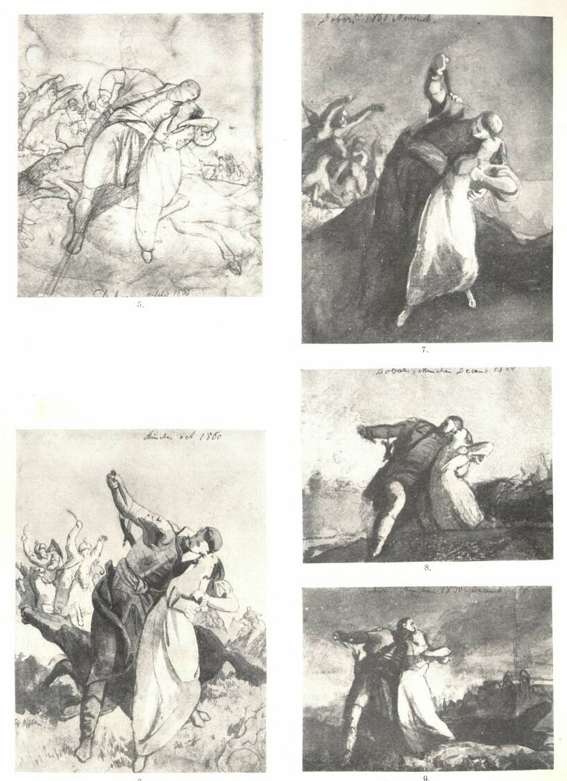 Az abstrakcióra hajló művész módján nem az optikai benyomás keltette érzés alakítja nála a viziót, ő keres, válogat, tárgyat hajszol, mely - - mint azt Poussin kivánta -nemes és eszmét magában foglaló legyen. Erre vonatkozólag egész akadémiai szabályzatok keletkeztek: mi a nemes tárgy? Nagyon meg kellett ezt gondolni s addig forgatni, alakítani, változtatni, míg az alapeszme tisztán és teljesen kiviláglik a formákból. Rethel öccséhez írt egyik levelében (1844 Jan.) a kompozícióról azt vallja, hogy egész törekvése az első érzés minél világosabb kifejezése, hogy a "seelisch geschaut'' viziót minél jellegzetesebben visszaadhassa. Székely is az egészből haladt a részletre, hogy az alapeszmének megfelelően minél tisztábban láthasson, mint maga írja: "hasonlít ez eljárás ahhoz, midőn távolban mutatkozó tárgyat megközelítve, alkatrészeiből, részleteiből mind többet és többet vehetünk szemügyre. Agyműködésünk is úgy közelíti meg tárgyait, ezek lényegéből is mind többet ismervén meg és biztosabban fogván fel, mennél tovább és minél behatóbban foglalkozik velük". (A figurális rajz, közli Palágyi i. m. 144. 1.) Ezért, minek utána nagyjában tisztában volt az "alapeszmével", Dobozy esetében a hitvesi együvétartozás példázatával, lerakja az első foltimpressziót (1. ábra) a tér proporcióival való vonatkozásában, határozatlan vonalakban jelezve a fény és árny viszonyát, de már a férfi-és nőalak egymásra hajlása, sőt a mellruháját letépő nő mozdulata éreztetve van. A férfi jobbkarja messzi kilendül a tőrdöfés mozdulatában. Egy 1859 decemberében készült rajzában (2. ábra) közeledünk a részletekhez, a foltokból alakok bontakoznak ki, hátul az üldözők, elől a mellruháját feltépő nő térdel, a leroskadt lóra támaszkodva, a férfi kardját előretolva megmarkolja azt s hátranéz, az üldözőket lesve. Az első vizio a szenvedélyes egybeolvadás és a töprenkedő kétség láto-mánya. Néhány hónap múlva visszatér az első gondolathoz (3. ábra), a férfi szenvedélyesen csókolja a szerelem paroxizmusában önfeláldozó nőt, miközben tőrét jobbjában szúrásra szorongatja. Ez a forma tisztul (4. ábra), a foltok viszonylataikat változtatják, a főcsoport balra húzódik a közeledő üldözőkhöz, s a jobboldal szabadabb. Októberben (5, ábra) a részletek gazdagodnak, az üldözők mindkét oldalon robognak előre, s a nő áll a leesett ló mellett, mellét feltépő mozdulata világosabb, de erejét vesztett. Majd visszatér a második változathoz (6 ábra). A férfi újra hátranéz, tőrét magasra tartja, az üldözők jobban látszanak, a nő reáhajlik, de a mozdulatok pillanatnyi ereje helyett egy átmeneti feszültségi pillanat van ábrázolva. A csoporti alakítás folytatódik (7. ábra). A nő szenvedélyes kilépése, a férfi túlságos ráhajlása, a magasra tartott tőr a feszültségi pillanat éreztetésében haladás. De ennél izgalmasabb, drámaibb a következő változat, 1860 decemberéből (8. ábra), amikor a nő térdre roskad, hozzátapad a férfihoz, de az nem vele, hanem az üldözőkkel törődik, tőrét kinyújtott kezében szorongatja, s ő maga is a lovára roskad. A kép proporciója is megváltozott, téglány-alakú lett, s az üldözők mindkét oldalról közeledve, a háttért betöltik, a kompozíció ilykép reliefszerű lesz, a csoport silhuette-je. uralkodik.