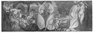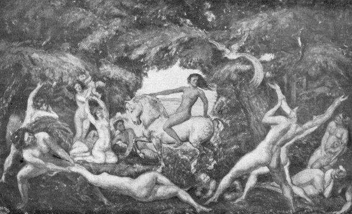 Ilyen körülmények között feltétlenül Iványi-Grünwald Béláról kell beszélnünk első sorban. Mert ő az a művész, aki miután egy megállapodott, biztos művészi irány első emberei közé küzdötte fel magát, egyszerre egy kataklizmát!kus változással szembefordult régi egyéniségével és egészen új irányok felé kereste az igazságot. Iványi Grünwald Béla művészetében meg van az új lehetőségeknek első feltétele: a múlttal való szakítás. Sőt ennél több is: a múlttal szemben új, más célok határozott, félre nem ismerhető hangsúlyozása. Ezekre a célokra ráismerni ma már nem nehéz, mert Grünwald Béla pálfordulása egészen határozott és világos volt. El a naturalizmustól, a szín túlhajtásától, a hirtelenségtől, a szétszórtságtól: a dekorativ stilizálás, a hatások koncentrálása, a nyugodt kompozíció az egység felé. Azelőtt vérbeli naturalista volt, színes foltokban felolvadó tájképek élesszemű mestere, ma nagy szimbolikus kompozíciókkal foglalkozik, amelyekben a tömegek egyensúlya, a vonalak rithmusa, a kompozíció, dekoratív hatása a fontos. Azelőtt csak festett úgy, amint a természet szeszélyes változatosságban eléje adta a festeni valót, ma tervez úgy, amint a lelkében feltámadt idea a színek és formák harmonikus egybeállítását megköveteli. Azelőtt a természettől kapta az impulzust, ma a lélkéből vetít kifelé a természetbe. Azelőtt a benyomások jegyében apró guerilla-harcot folytatott a természettel, ma nyugodtan, megfontoltan megy bele a küzdelembe, mint egy széles áttekintésű hadvezér. Régi pikturájában kis, elfoszló szépségelemeket kötött le, ma mindig és mindenütt az ideált akarja. Ezért skálája idealisztikus, rendező, szellemibb, öntudatosabb lett. Azelőtt képein kifejezte a világ szépségének egy-egy momentumát, színes jelenségeket, a fény pillanatnyi játékait, s a szépség harmóniájának egyetlen egy akkordját, ma nem hangsúlyoz semmit külön, ma a világ, a művészi alkotás szépségét akarja az összes rendelkezésére álló eszközökkel, a festői hatáskeltés minden lehetőségének egyenlő kiaknázásával és kiegyenlítésével.