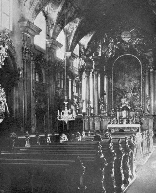 A tagolatlan nagy felületeknek a festészet eszközeivel való architektonikus kiképzése -a Sixtus-féle kápolna óta a mennyezetfestők fontos problémája — elég szerény. A boltcikkelyek fölött hatalmas párkány vonul körül: e fölött már a festészet birodalma kezdődik, mennyei régiók nyílnak meg. A fél pillérek fejei fölött, a boltcikkelyek között, tömör, erősen bárok ízű architektonikus keretben egy-egy fülke van festve, amelyben, kiugró konzolon, egy-egy ülő alak foglal helyet: a négy evangélista a szentélyben, négy próféta a hajóban.