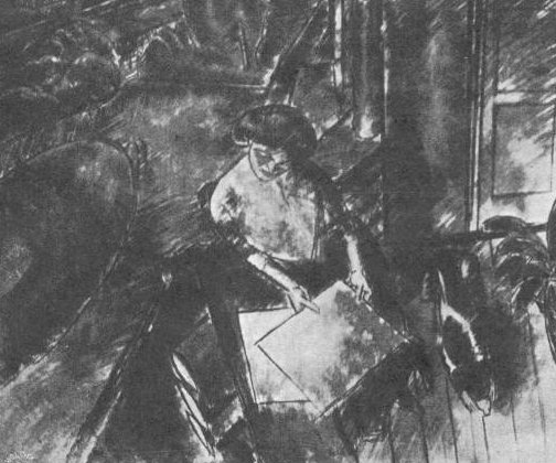 A másik meglepetés Tichy Kálmán meseképsorozata. Aquarell-rajzok ezek, játékos kedvvel, ritka ízléssel előadva, oly kedvesen meseszerüek, hogy a külföld mesterei közt is nem egykönnyen találunk melléjük állítható dolgokat. Igen kevés eszközzel készült mindez: inkább a mesehang biztos eltalása kap meg minket, semmint valamely szorosan vett festői elem. Ezek a képek valóban megérdemelnék a színes sokszorosítást.