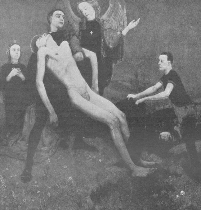 A kiállítás «clou » -ja egy szörnyen gyenge rajzú óriási kép, amely a trónörököst és huszárait Leistikow-ra emlékeztető tájba beállítva lovon ábrázolja, — teljesen érdektelen gyenge (persze nagyon megcsodált) munka. A bécsi Matsch fejedelmi arcképvázlat sorozata, mely a német uralkodók hódolását királyunk előtt ábrázoló nagy vászonhoz készült, jellemző és becsületes, bár korántsem érdekes dolgok. Ezeken kívül a kiállítás alacsonyrangú és érdektelen. Bár Giallina korfui festőt a császár nagyszámú vásárlással tüntette ki, semmiféle qualitással nem bír, színtelen, erőtlen, dilettáns. Van egy szégyenteljesen gyenge nagy terem, ahol a közönség a legjobban gyönyörködik: «Jagd und Sport» a neve, igen jellemzően e «művész-csoportnak mely ügyefogyott és giccses kutya és lóportraikat, lila tájakat természetesen legelésző szarvasokkal stb. stb. összehalmozott.