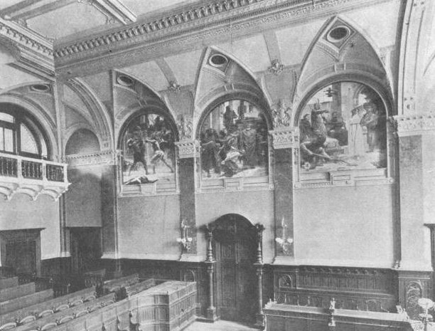 A törvénykezési palota szintén rendkívül finom részletképzéssel, a komoly célnak megfelelő egyszerűséggel és a nélkülözhetetlen árnyékhatás szellemes megoldásával köti le figyelmünket. Amellett műszaki szempontból ugyancsak elsőrendű alkotás a homlokzat anyagának gazdaságos és fölötte ízléses megválasztásával. Itt is kedves, harmonikus ritmus ömlik el a kompozíció egészén, a nyílások és falpillérek kellemes váltakozása folytán. A törvénykezési épület esküdtszéki terme komoly előkelőséggel egészíti ki az épület tiszta olasz renaissance hatását és különösen finom a kecses oszlopokkal megoldott ajtó keretezése.
