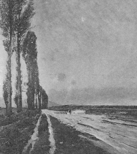 Ez a festői csoport, e népes terület, a maga - pontosan alig meghúzható — határain belül, a legkülönbözőbb festői előadásmódokat foglalja egybe. Az elnevezés közös: naturalista. De hányféle stilus, hányféle művészi érték e sokszor használt, de új tehetségek révén a megkopástól mégis mindig megvédett fogalom mögött! Mennyire más ez ott, ahol a természet a festőnek foltokban jelentkező színes tünemény, s ott, ahol bizonyos költészeti tartalom is lappang, sőt ahol első sorban ezt kívánják az ecset emberétől, az érzelmek megütését. Mint például Spányi Bélánál s a vele egyívású nemzedék képeinél. Mennyire más művészet ez, mint mondjuk, a nagybányai képeké. Pedig Spányi Béla is, a bécsi akadémián tanított s a képvásárlóknál divatos fémjelzésű pathetikus tájkép sablonjaival szemben, az igazság forradalmi erejére esküdött. Pedig mindkettő naturalista: a Hollósy-kör friss tehetségeinek festése, amelyen Nagybánya napsugara ragyog, s Spányi Béla ezüstszürkéi, komor fellegei, ólmos levegőt hordó jegenyéi és mocsarai.