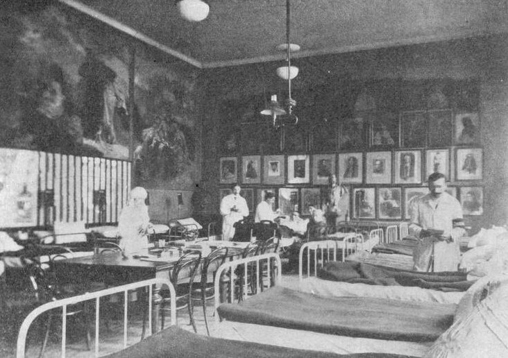 MŰVÉSZETI INTÉZMÉNYEINK A HÁBORÚBAN. A háború kitörése teljesen felforgatta összes művészeti intézményeinknek ez év őszére és telére készített programmját. Művészeink egy része hadba vonult, az itthon maradottakra az a nehéz feladat várt, hogy épp oly derekasan kivegyék részüket a nemzeti küzdelemből, mintha a tűzvonalban volnának. S e feladatot derekasan meg is oldották. Mindazok a művészeti intézmények, amelyek itt tekintetbe kerülnek, nevezetesen a Műcsarnok, a Képzőművészeti Főiskola, a Mesteriskolák, az Iparművészeti iskola, átalakultak hadikórházzá. Hogy a jövendő idők számára megőrizzük ezeknek az intézményeknek képét, amint a háború kívánta magasztos célt szolgálják, Fabinyi Lili hat fényképfelvételét közöljük ebben a füzetben.