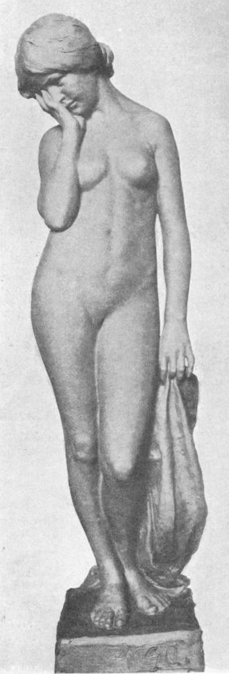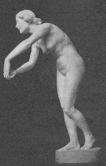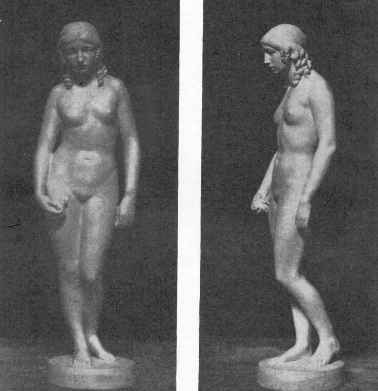 Sámuel Kornél a budapesti iparművészeti iskolából, Mátrai tanártól a természet minden részletének igaz megbecsülését, a formák aprólékos halmozásának kultuszát hozta magával, egy bizonyos agyagkezelési készséget, mely a bécsi, mondjuk tilgneri virtuozitást nagyra becsülte, agyagban gondolkozott, s rákényszerité annak puha, formálható, játszi módon meggyúrható természetét a márvány szigorú erejére. Münchenben rámutattak e felfogás veszedelmeire, mely anyagszerütlenségre vezet és mint Tilgner Mozartjánál látjuk, eljut a márvány elsúlytalanítá-sáig, csakhogy játszi bájt és anyagtalanná vált anyagot formálhasson. Az anyag természetének folytonos szemmel tartásával kell mintázni, -hirdették és Sámuelnek első jelentősebb müve. mellyel a Műcsarnokban megjelent, tiszta kő-kompozició. Az arcát tenyerével eltakaró leány alakja, amint baljával ruháját tartja, megmarad az uralkodó kontúron belül, semmi sehol sem válik el a törzstől, minden forma benne él a kőben, melyből kiemelték. De a főkoníuron belül minden forma szeretettel teljes megfigyelés is, a legfinomabb részletrajz, a leggondosabb anyagéreztetés, a hús és csont, a bőr és a lágy és kemény részek gondos éreztetése, nem csupán a főformák kikeresése, de élet és valóság és egyéni igazság minden egyes formája. Együtt egy nagy érzés, mely minden formán végigsuhan, a hanyagul hátrahajló balláb, az előreeső fő, a lehulló balkar mind egy alapérzésből alakul. A formák gondos megfigyelése, kitapintható leírása Sámuel művészetének alapja maradt mindvégig. A fény és árnyjáték imaginativ értékeit nem kereste. Az ő pozitív szelleme megmaradt a formahatárok között mindvégig. Érdekesen illusztrálják ezt későbbi arcképtanulmányai, főleg feleségéről készült portrait-ja, mely minden hasonlóság mellett, mely az egyéni sajátosságok kikereséséből alakult ki, valami általánost, egy alapérzést, hangulatot tükröz és szimbólummá emelkedik. Mindez már sejtetve volt első aktjában. A Harkányi-díj fiatal győztesének továbbfejlődése elé tehát ettől kezdve méltó érdeklődéssel tekintettünk.