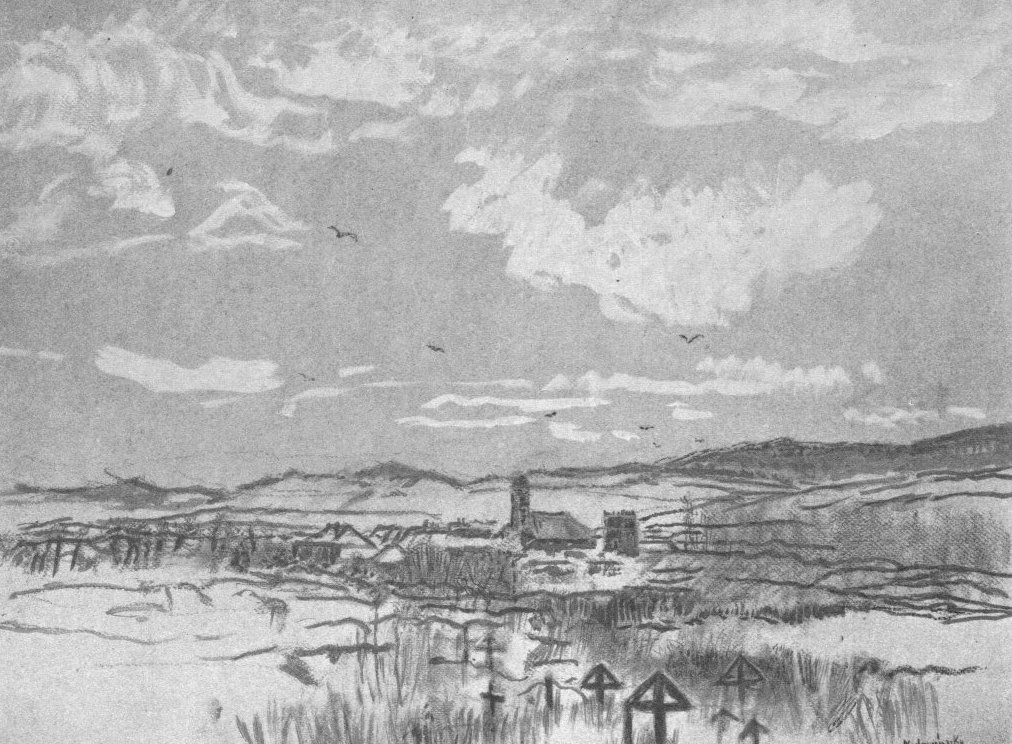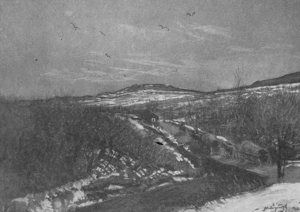 Néhány barnás folt a nagy fehér vásznon, amin a vászon fehérsége adja ki a havat és az eget. Óriási dombos terület Przemysl alatt, — elhagyott lövészárkok, itt is néhány sírkereszt, amott is néhány hirtelenében összetákolt sírkereszt... Amit Verescsagin halomba hordott, feloszlásnak indult tetemekkel mond el, a csatateret, azt megfösti ő is, olyan kevés színnel és föstékkel, mintha csakugyan ott, egykét perc alatt, a harctéren kapta volna le, ugyanazt kifejezi ő is, de az ő csatatere egy behavazott lankásan dombos vidék, ahol már üresek a lövészárkok, ahol nincsen már egy eleven lélek sem, nincs többé egyetlen emberi alak, csak egy-egy hirtelenében összetákolt fa-kereszt a lövészárkok mentén — az elhagyatott nagy temető.