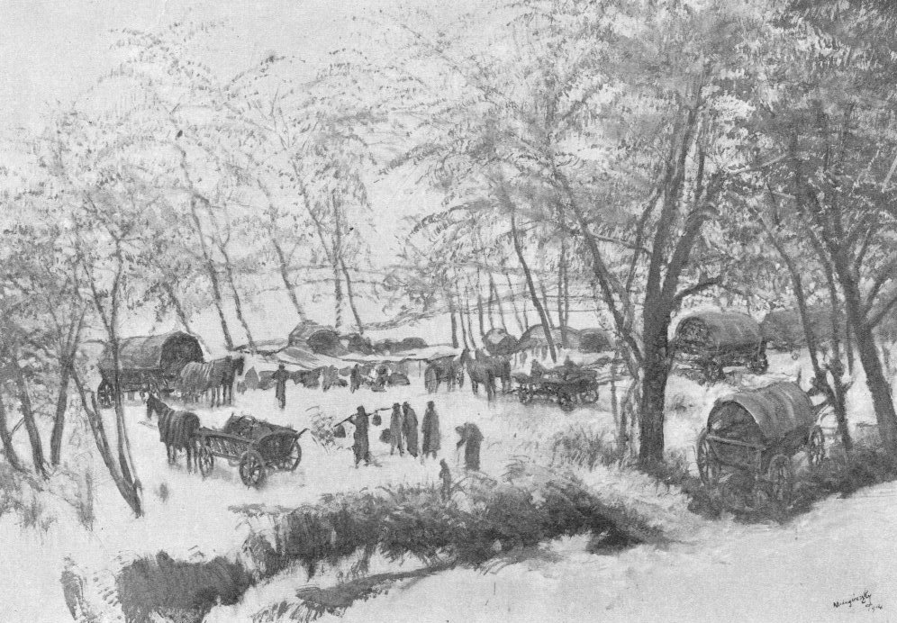 Hogy tolják föl a domboldalon, feneketlen sárban a vöröskeresztes betegszállító szekeret a katonák!... Hogy bújnak meg erdőszélen s raknak egy kis tüzet a hóban a menekülők... Egy-két odalehelt barna folt s ott a hajnali ködben az erdőszálen pihenő lovasőrjárat... A Száva-parton az ágyúk ; a mitrovicai híd ; az első hó s a faluban pihenő szekértábor ; valahol ágyúznak s fa mögé bújva lesi az eredményt egy ember... Vonul a havas országúton a vöröskereszt, s hogy milyen kórház az a vonulás, a lovak mozdulatától kezdve a szomorúan baktató kísérőkig!.. Most indul a tábor ; a parti füzesben rostokolnak a szállítószekerek: dombvonulat mögött, ahonnan riadtan iparkodtak el a varjak, ütközet kezdődött, s emitt, a dombok aljában vonult meg a írén, lepi őket a hó, mintha már szemfedőjét szőné rájuk az elmúlás.