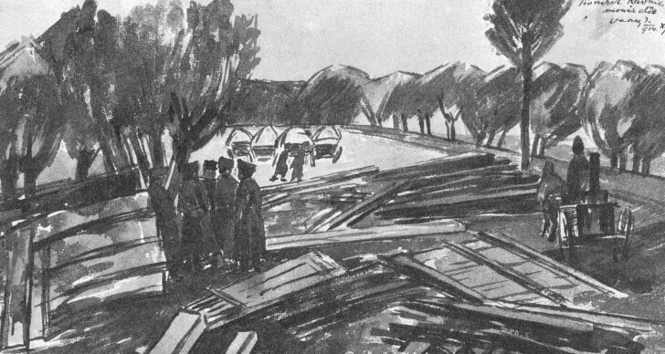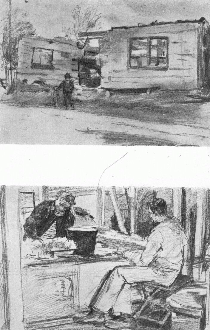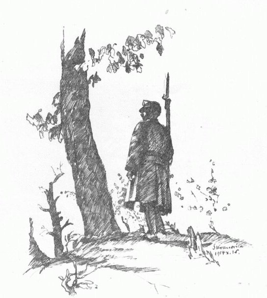 Láttunk tőle rajzokat, melyekben a dúló szenvedélyek levegője izzik. Ha mostani rajzainak egy részében a lehangoltság, a szomorú hangulat uralkodik, annak okát két momentumban kell keresnünk: az egyik az, hogy épen ezek iránt a hangulatok iránt a legfogékonyabb a müvészlélek, a másik pedig az, hogy a művésznek, akinek ezek a rajzai a látottak közvetetlen benyomása alatt készültek, az ütközetek hevében részt venni eddig alig volt alkalma.