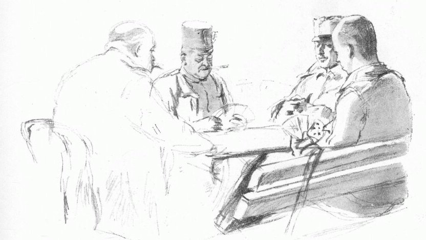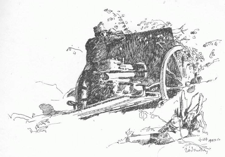 Az északi harctérről a hadisajtószállást levezényelték a déli harctérre, akkor betekintett hozzánk a művész (lovaglónadrág, lábszárvédő - és az elmaradhatatlan esernyő), beszélt igen sok érdekes és nagyon tanulságos dolgot, s azután, s azután, ment le ő is, délre.
