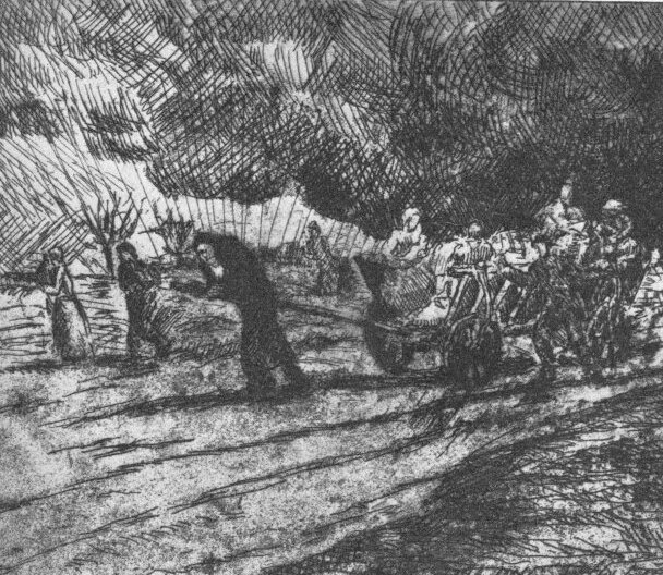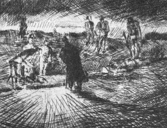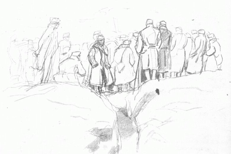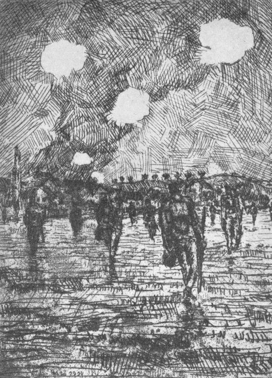 Alig két-tenyérnyi galambszürkés papiros ; a papiros szürkesége adja az alkony borongását ; messze háttérben vöröses csík, ott alkonyodott le a nap ; a távolban dombvonulatok, egy-két varjú, s néhány fehér folt a felhők Egy csoport halad, ügylátszik rajtuk, hogy ahová mennek, onnan többé visszatérés nincsen. Legelöl egy szuronyos katona, fázik, fáradt ő is ; mögötte egy suhanc, azután még öten, inkább züllött, már mindenről lemondott alakok, és mögöttük két szuronyos katona. Viszik őket, bűnhődni.