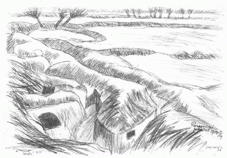 «Édes Buli! Nagy köszönettel vettem ma este leveledet, valóságos csoda, hogy soraid idetaláltak. Mi ismét távol bolyongunk a presse-quartiertől... A rajzok nagy tömegben készülnek, kissé lassan megy a dolog, mert nagyobb csoportokban járunk, s egy a természet előtt készítendő rajzra alig jut 10 — 12 perc. Ez idő alatt minden lényegeset belé lehet ugyan a vázlatba, hozni, de ez a sokszorosításra még sem alkalmas. Más papirosra kell a dolgot, kissé rendesebben, némi kiegészítésekkel átrajzolni. Ezen művelethez egy kis világosság és néhány napi nyugalom kell, ami csak nagyon szórványosan akadt eddigi vándorlásaim közben. Most van egy világos szobám, ha néhány napig innen ki nem zavarnak, sok rajz és akvarell készülhet el. Amint a presssquartierhez visszatérünk, elküldhetem valami módon. Fokozatosan mind szebbet és érdekesebbet látok.