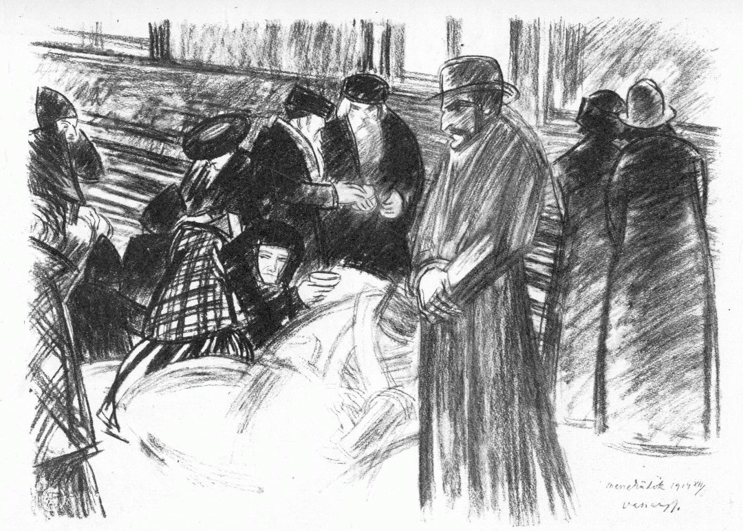 És az éjszakában és a hajnalban és az alkonyaiban: menekülők. Sebtiben felpakkolt szekéren a fehér szakállas öreg zsidó s mellette öreg párja, az asszony... Egy másik szekéren sebesült katonák és egy halott.