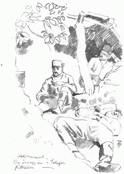 A lövészárkok ellen rendezett szuronyroha-mokat kivéve, a harc a láthatatlan ellenség ellen folyik. Nagy távolságokról jön a srapnell, a fedezék a lényeg és a katona élete ott folyik le a lövészárokban. Ezek a jelenetek kapták meg a harcvonalban élő művészt is elsősorban. Odajegyezte magának a naplójába Herman is a lövészárokba vezetett telefont hallgató őrnagyát, amint mellette hanyatt fekve alszik a baka, mögötte felfigyel a másik, a telefonon érkező parancsot várva. Ezek drámai érdekességű mozzanatok, mert ettől függ sokak sorsa. S mégis, a művész érdeklődése itt nem a tárgyhoz fordult, hanem a hanyatt-fekvő katona mozdulatához, melynek széles vonala és nagy gesztusa kötötte le figyelmét és sietve feljegyezte. A mozdulat eredetisége és ereje érdekelte Hermant a béke idején is -a szeme erre volt beállítva, ezt látta meg most is. Képzelem, mennyi ilyet gyűjtött össze emlékezetében, hogy a háború után előszedhesse őket emlékezete raktárából, csupa új és kiadatlan mozdulatot, nem épen háborús tárgyú képekhez, de olyanokhoz, aminőkre ezek a feledhetetlen emlékek, a hónapokon át szerzett nagyszerű benyomások ihletni fogják. Mert - hiába, - - a művész lelke kész instrumentum, melyet semmiféle idegen hatás meg nem. másíthat, csak kicsalja belőle a benne lappangó melódiákat átformálva, átalakítva, az új hangulatok hatása alatt. A másik rajza, melyet mindjárt az első benyomások idején (aug. 12.) jegyzett fel: mozgás-megfigyelés. A láthatatlan ellenséget kémleli a fedezékből a tiszt úr, azon igyekezve, hogy ő maga is láthatatlan legyen. Ezért fordította meg a sapkáját is, hogy ne csillogjon a szemellenző. A harmadiknál is a mozgás-visszaadás a lényeges. A gúlába rakott fegyverek mellett pihennek a katonák, ülve, fekve, ledőlve, miközben az egyik szemben fekszik, tökéletes rövidülésben. Ennek a visszaadása, mely mellesleg megjegyezve, virtuóz módon sikerült, foglalkoztatta a művészt. Festő maradt ő a háborúban is, ugyanazon problémákkal terhesen védte a hazát, amelyek azelőtt a műtermében foglalkoztatták.