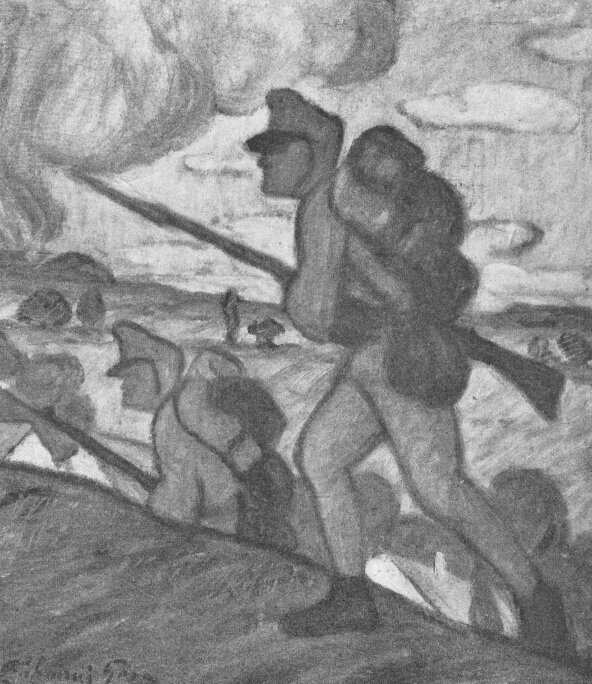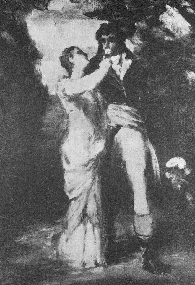 Ez a vázlat, amely méretre kisebb a múzeuménál, ugyancsak a szabadban egymáshoz simulva lépkedő szerelmespárt ábrázol, s a nő hasonló mozdulattal, mint amott, itt is virágot nyújt szaglásra szerelmesének. Azonban a két vázlat között gyökeres különbségek vannak. Már az alakok külső megjelenése is más a kisebbik vázlaton: zömökeb-bek, s öltözetük a forradalom korabeli ruha helyett szabadon formált antik lepel. A jelenet alaphangulata is más. A múzeum vázlatán egy kis pajzánság vegyül az ábrázolásba: a nő mintha incselkedve tartaná a rózsát a zord tekintetű forradalmár orra alá, hogy zavarba hozza ; a kisebb vázlat alaphangja komoly. Még lényegesebb a különbség rajz és színezés dolgában. A nagyobbik vázlaton látszik, hogy hevenyészve-vetette oda a művész, s nem sokat törődött a csoport kikerekítésével. A férfi ballábával erősen kilép, jobblábát pedig a művész megoldatlan hagyta, s ennek következtében egy lyuk maradt a kompozícióban. A kisebbik vázlaton ez a lyuk eltűnik, s az alakok zárt, kerek egységben olvadnak össze. A nagyobb vázlat tiszta és telt színfoltjaival bokrétára emlékeztet, melyet frissen szakított virágokból kötöttek ; a kisebbiken a művész első sorban a tónus szépségére törekedett, s a színeket aranyos zománcú, mély harmóniában egyesítette. A múzeumi vázlat előadása heves és bátor, mint az első ötleté, melyet a fogantatás lázában ír le a művész ; a kis vázlat megfontoltabb és következetesebb, de egyszersmind hiányzik belőle az a tűz és közvetlenség, mely amazt kitünteti.