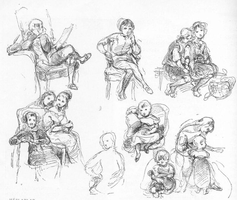 Teljesen angol hatások alatt áll más két aquarellen: a «Hazatérés a vadászatról» «Mor-land és Wilkie hatását mutatja ; egy másik kompozíciónál, mely talán egy házaspár portrétanulmánya, Reynolds nagyúri arcképeire kell gondolnunk, pl. Hamilton hcg. és hcgnő közös portréjára, hol a háttérben impozánsan és majdnem romantikusan hat a hatalmas park képe.