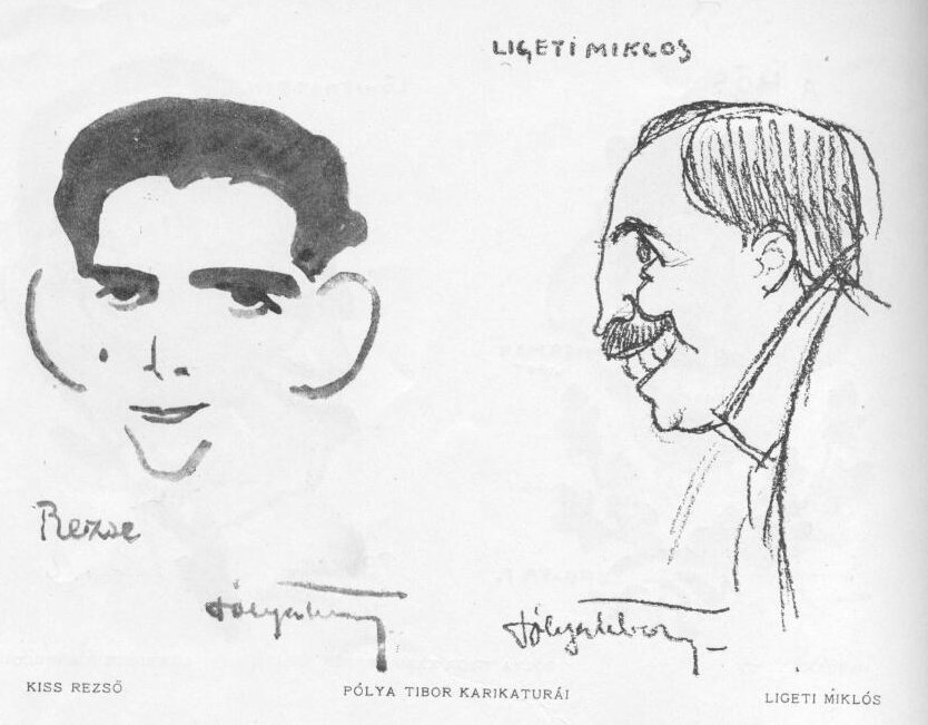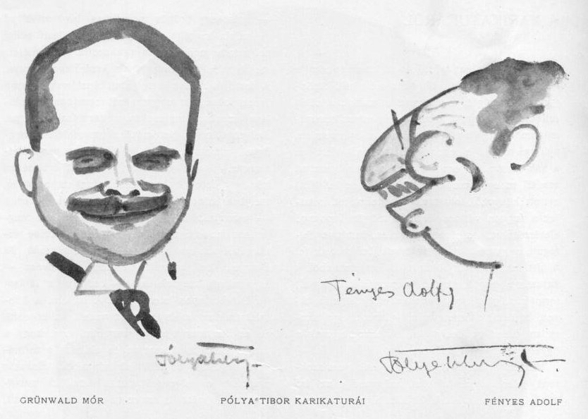A titkos jelleg torzító ábrázolása tehát a karikaturarajzoló legfontosabb feladata. Minél mélyebben lát bele az emberi lélekbe, s ösmeri fel azok gyengeségeit, merevségeit, s lelki hibáikat, azt, a mi komikussá teszi formáikon át a lelkűket, annál nagyszerűbb, mélyebb a hatása. Hogy ezeket a felösmeréseit mennyire művészi eszközökkel fejezi ki, attól függ a művészi értéke. Az absztrakt képzeletű művész első sorban gondolati tartalommal akar hatni, szimbólumokhoz fordul. Guldbranson Klingernek a hajából sastollakat csinál, Caran d'Ache Vilmos császárnak sascsőrt ad, Durant (1691-ben) XIV. Lajosa a sugaras nap, amint barátcsuhából bújik ki, Pólya Tibor nem tartozik közéjük. A konkrét képzeletű művész az adott formákból indul ki ; Breugheltől kezdve, a ki diabolikus erejével fejezte ki a természeti formákban lappangó komikus hatásokat, -- ha egy faág emberi orrnak hatott, hát emberi orrnak rajzolta! — Goyáig, — aki a borzalmasban rejlő komikumot is meglátta, — a konkrét képzeletű művészet a karikatúrában az adott formák torzításával érte be. Giraud Delacroix-ján a nyakkendő uralkodik, Kio-Sai a mozdulatok torzításával karikiroz, Ibels is, Forain is, de főleg Daumier a formák humorát keresik, de e nemben a legeredetibb a Charivari híres karikatúrája Philipon-tól Lajos Fülöp királyra, a kinek fejét — körtévé egyszerűsítette, Meglátni az arcban a benne lappangó fintort, a mint hajlik valami állandó formára: mintha trombitálna, vagy vigyorogna vagy megmerevedne a bábszerűben, — ime a karikaturarajzoló kifejező eszköze. Pólya Tibor ezt gyakran felhasználja. Bednár feje olyan mint egy francia bábu, merev mozgásnélküli, formaszegény: két pont a szem, egy-egy vízszintes a szemöldök, s a tekintet merevségében a bábszerűség. Grünwald Mór építész arcán ott lappang a mosoly, ha haragszik is: felfokozta. Benne van minden vonásban: a túlnagy homlok, a széles áll éppen úgy nevet, mint a füle és természetesen a szeme és szája. S ez a nevetés csupa bonhomia. Hermán Lipótnál is a nevetést emelte ki: egy vonás lesz a szeme, kivillognak a fogai, összehúzódik a homloka, lehull az álla. S ez a nevetés csupa malicia. Fényes Adolf is nevet, miközben kidagad a pofacsontja, előre szalad az orra, hátrafut a homloka, remeg a tokája. Ez a nevetés maga a vidám somolygás. Löwenstein igazgató maszkja is nevet, miközben a szemöldöke felfut, az ajkai szétesnek, az orra kacskaringós arabeszk, s az egész kifejezésben van valami — majomszerű. Ez a kezdő karikaturaraj-zolók kedvenc fogása, amikor az emberi arcnak állatra emlékeztető vonásait túlozza, mint Gabriel Max híres képén: A kritikusok, hol München híres kritikusait festményt néző majmoknak ábrázolta. Van ennek egy ellentéte: mikor az állatot elemberiesítik, mint Oberländer, Caldecott, Busch, vagy Goya, a ki a szamárt mint orvost viszi a beteg ágya mellé. Az abstrakt képzeletű művész itt is szimbólumot csinál ; szamárfejet adott már 1523-ban a névtelen rajzoló a pápának, a hárpiára Mária Antoinette fejét rajzolta a forradalom karikaturistája, s Halbe fejét rajzolta egy pincsire a Simplicissimus. Ez irodalmi ízű karikatúra, melynél nem a forma a lényeg. Daumier nem akarta szöveggel ellátni rajzait. "Ha rajzom nem mond el mindent, — akkor rossz, — a szöveg már nem segíthet rajta", — mondotta. Az igazi karikaturista kerüli a filfantasztikust, a túlálta-lánosítást, — szóval az abstrakcióra hajlást. Pólya sem fordul ilyenhez soha. Őt a formákban rejlő komikus erő érdekli. Ha meglátja az állatot az emberben, siet azt kiemelni, így tett Ligetivel is, a kinek nevetésében van valami brutális íz, a ragadozó állat vadsága, a mint prédához jutott, — a mi a tágranyitott szemben, a görbített orrban, a nagy fogazatban fejeződik ki. Ebben a nevetésben van valami kányaszerű. Íme így tud jellemezni Pólya, a formákban rejlő fintorokkal, a jellegzetesnek túlhajtásával, — mindez nem Goya vagy Daumier módja, akik megkapni tudtak az igazzal, s a komikus mozdulatok erejével eljutottak az iszonyatosig, a rettenetesig; nem Hogarth módja, aki a komikus formát kiépítette a legapróbb részletig, miközben a társadalmi félszegségek humoros fin-torjaiban nagyszerű arabeszkeket talált, mint a Taste in High Life krinolinos öreg asszonyában, mely valóságos háromszögre való visszavezetés. Pólya formája a vonal, de nem az abstrakt, mindent egybefoglaló, mint Sem vagy Caran D'Ache, Gavarni vagy Busch vonala, kik már-már csak jeleket adnak, éreztetnek inkább, semmint elbeszélnek. De viszont Willette vagy pláne Gibson részletező, halmozó, aprólékoskodó vonala sem, hanem a két véglet közt mozgó, mert egy pár vonásból épít fel egy teljes egészet, mint Kiss Rezső karikatúrájánál, a hol a buja szemöldök és tömör haj éles ellentétje az áll, a száj, és a fül sovány vonalának ; majd csupa apró forma halmozása, mint Diner Ákos rendőrtanácsos képén, ahol a szemöldök égnek meredő vonalán kívül minden mozog, hajlik, görbül, egymás ellen a szemek, lefelé az ajk, fölfelé az orr-cimpa, s ez a mozgás adja az álarcot. Meglátni azt, a minek ugyancsak felbontó ereje van: ime Pólya tehetségének uralkodó vonása, a karikaturarajzoló par excellence ő, a disproporcio iránti érzékkel, melyet minden arcban meglát és kiemel. Ez az oka, hogy. önmagunkról nehéz karikatúrát csinálni: ki látja meg önmagában azt, a mi benne disproporcionált? Még a rólunk készült karikatúrát sem tudjuk megítélni. Ki ösmeri el, hogy a karikaturarajzoló-tól meglátott fintor valóban ott ül arcunkon? Nézem, nézem a magam karikatúráját, melyet Pólya csinált és — rád bizom az ítéletet olvasó! A karikarura nevetségessé tesz, a nevets