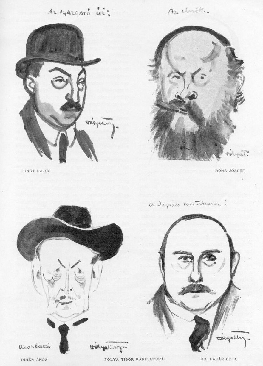Mindez általános emberi, melynek nem szoktunk jelentőséget tulajdonítani, pedig az író ebből gazdagszik, ebből táplálja képzeletét, mely - mint egy örökös mozgásban levő szivattyú — szívja magába a benyomásait, a festő pedig ezt szinte módszeresen gyakorolja, neki az életmegfigyelés tanulmányainak kizárólagos tárgya. A festő formához akar jutni, képzeletstrukturája szerint absztrakt vagy konkrét formához ; kiindulása azonban mindenkép a természeti forma, melyet a maga életérzésének megfelelően megfigyel, átformál, alakít. A forrás a nagy életátabota, a vad életvásár, melyen őrületesen kóvályog, forog, nyüzsög-mozog az emberi állag, melyben mindent megtalálhatunk, valamit csak — keresünk. S itt van a művészetnek megértését szolgáló újabb pont. Az élet gazdag tartalmából azt emelhetjük ki, a mit akarunk, de akarnunk kell, akarni kell tudni. A művész — hajlamának megfelelően — beállítja a látását az élet bizonyos jelenségeire. A hajlam, a kép-zeletstruktura a lényeges, ez vezeti, ez képesíti, de ez kényszeríti is egyszersmind arra, hogy a maga formáját kikeresse és alakítsa a természet végtelen sokrétű alakulataiból. Sokszor elnéztem a kávéházi asztalt körülülő művészeket, a mint telerajzolva a márványasztalt, kezük — mialatt a legtávolesőbb tárgy-ról folyt a szó — szinte gépies öntudatlansággal formáról formára haladt ; de a legegyszerűbb vonásban is benne volt az egész ember; a rajzok után megmondhatjuk, ki ült azon a helyen? Ilykép bizonyos meghittség áll elő, meleg együttérzés, közvetlen kapcsolatok és a festő, ki megszokta a formaviszonylatokat kutatni, jobb hiányában belebujik társai arcába, figyeli azok változatait, a sajátos alakulatokat, az egyéni jegyeket. Nem véletlen, hogy a művész oly sokszor festi, mintázza a társát. Rafael (az athéni iskolában) Bramante és Leonardo arcmásait festette görög filozófusoknak. Általán ösmeretes Dürer müncheni arcképe mesteréről Wolgemutról. Ujabban főleg Leibl életeművében találkozunk nagy számmal társainak arcképeivel. Fantin-Latour Delacroix dicsőségére megfestette Manet-t és körét, Courbet műterme modelljeit, látogatóit és barátait festette meg «L'Atelier» c. művében. De hivatkozhatunk Marées arcképére, melyen önmagát és baráját Lenbachot ábrázolta. Blauchenak luxembourgi arcképére, melyen barátját a norvég festőt Thaulowot örökítette meg, A festő pajtás jó modell, — tudja, mit jelent az: elmerülni a formákba és türelemmel megvárja, míg társa «kihozza» a formát, melyet keresett. A művészkompániák intim hangulatából ilykép nemcsak zsűrilisták, személyeskedések és intrigák. születtek, hanem művészi megösmerések, formakitalálások, lélek-revelációk is. Nagyon természetesen — karikatúrák is. Sőt elsősorban karikatúrák. A karikatúra az intimitásból születik és az intimitás számára készül. Megtalálni a karikatura formáját csakis ösmert, százszor látott arcon sikerül, felösmerni a karikatúra torzításait csakis akkor lehetséges, ha ösmerjük az eltorzított arcot normális, torzítás nélküli állapotában. Innét van az, hogy a nagyközönséget csakis általán ösmert, hírneves emberek karikatúrái érdekelik. A karikaturarajzoló művészete abban áll, hogy a közismert embereket új világításba állítja, azoknak torzító tükörrel felfogott képét adja, miközben titkos tulajdonságaikat reveiálja. Minél szélesebb körben ismert embert leplez le ilykép, hatása annál általánosabb. De a művészi eljárás nem változik, ha nem a nyilvánosság előtt, hanem csak szűkebb körben szereplő egyént kari-kiroz is, — mint tette azt Pólya Tibor, ki a Japán művészasztal tagjairól készített egy sor karikatúrát, talán a legjobbakat és legjellemzőbbeket, miket e nemben ma áltálján produkálnak E sorozatból bemutatunk 13 darabot, talán elegendő ahhoz, hogy hozzáfűzhessük a karikatúráról való megösmeréseinket.