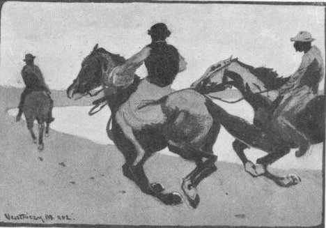 Ha azt akarjuk, hogy a ló-portrait helyesen tükröztesse vissza az eredetit, annak minden jó pointját, a tiszta profilt kell választanunk. A félig elölről vagy hátulról vagy ferde állásban leföstött lovak még a fotográfia útján sem mutatják helyes és geometrikus arányaikat, s még nehezebb a festő helyzete, aki sem nem gép, se nem tanult hippológus s így a távlatnak már apró elvetésénél ki fogja fordítani model-jét igazi alakjából, Aki megfigyelt valaha egy versenylovat istállójában és azután az említett ferde helyzetben készült pillanatnyi fölvételt lát róla, tiz telivér közül kettőt sem fog felismerni. Mentői inkább en face áll a ló, annál kevesebb a megrögzíteni való tényezője ; pointjai, vagyis lapocka, farkrész, háta, marja, nyaka, fejének illesztése, kötése stb. megkívánják a profilben való állást. A lónak az említett testrészek a legfontosabb pontjai ; a lószem, az en face fej keveset mond. Tüzes szemü lovak, a régi iskola e kedvencei, rendesen a legrosszabbak ; a ló karaktere megjelenésében, tartásában, mozdulatában inkább nyilatkozik meg, ha ugyan egyáltalán szó lehet róla, hogy belső életéből valamit elárul. Hogy példát mondjak, a visszahúzott fül a lónál rendesen rosszakaratot jelent, s ez az egy motívum többet fejez ki, mint esetleg az egész arc részletesen kidolgozott, az emberi élet megnyilvánulására épített gonoszsága.