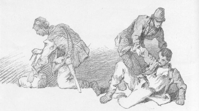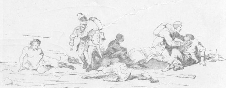 Elöl a jobb és balsarokban s kissé hátrább a középen elesett, sebesült és az utóbbiakat támogató katonák. A középső csoportban kettőről meg is állapítható, hogy pirossapkás. A rajzok mutatják, hogy a többieket is, ha — nem is mind, de túlnyomó nagy részben — honvédeknek képzelte a művész.