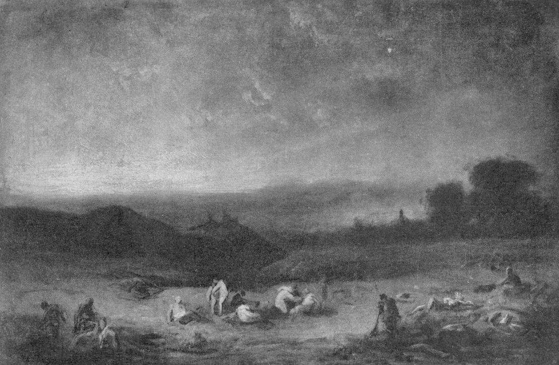 A mester utolsó korszakából való tájfestményeken gyakran találkoznak ugyanazokkal a hangulatkeltő tényezőkkel, melyek az «Isaszegi csatatér »-en is uralkodnak: a szürke alapto-nusból kivilágító sárgásfehér és tűzvörös fénynyel. Látszik tehát, hogy e festői értékek ott forrtak a művész lelke mélyén már az ifjúkorban. Ott derengtek bizonyára már akkor is, midőn a művészöntudat még nem ébredt fel a gyermekben. Ott élhettek szomorú melancholikus érzésekként, mint emlékek a nagy időkből.