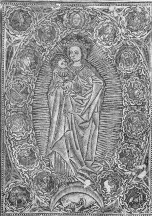 MADONNA A FÉLHOLDON ÁLLVA, XV. SZÁZADI ÉRCMETSZET. A Művészet 1914. évi december havi számában ismertettük grafikai gyűjteményünk XV. századbeli fa- és ércmetszeteit. Azóta ez a sorozat egy érdekes ércmetszettel gyarapodott, melynek kisebbített mását itt közöljük. Az ércmetszet a Madonnát a félholdon állva ábrázolja, körülvéve Krisztus és az apostolok 13 medaillonjával. A négy sarokban a négy evangélista jelképe. A színezés rózsaszín, zöld és sárga.