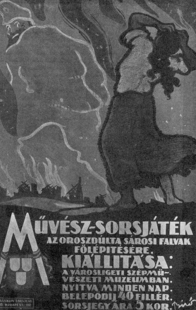 A közönség már ismeri azt a plakátot, amely megrázó egyszerűséggel invitálja egy művészi esemény falai közé. Az utcán, az élet forgalmas pontjain mindenütt ott van e plakát, amely ily irányban egy frappáns képességű művész — Biró Mihály — munkája, s amely a nézőre nem tévesztheti el mély hatását. Egyszerű, paraszti nő tekint a távolba, ahol üszkös romok látszanak, a haját viszi a szél, a mozdulata kétségbeesés, az ég csupa tűz. s a vörös és sárga lángokból egy kozák alakja rajzolódik ki, ijesztő rém gyanánt...