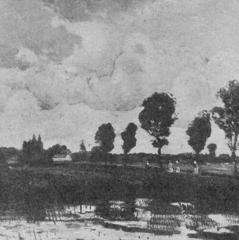 A naturalista ízű festés más és más szépségeit nyújtja a tájképek sorában báró Mednyánszky László egy borongós őszi képe, Szlányi Lajosnak tiszavidéki tája, Glatz Oszkár élénk plen'airjei, Bosznay, Katona, Magyar Mannheimer, Zombory, Pajtás (Szmrecsányi) Ödön és mások munkái. Ugyanezen törekvésnek figuralistái közül itt van két tolnavármegyei leány plasztikus előadásával Paczka Ferenc, egy interieurbe helyezett holland nőtipussal Perlmutter Izsák, Strobentz Frigyes, Révész Imre. Stílusának újabbi, már nem «nagybányai» idejéből Fe-renczy Károly egy Szinyei-Merse Pálról festett portraitját küldte el. A portraitok közt kiemelkedő darabja a tárlatnak a Bécsben élő Horovitz Lipót egy nagyobb grafikus lapja, s egy prémes, téli elegánciájú hölgy, amely köny-nyen megérteti Halmi Artúrnak külföldön elért