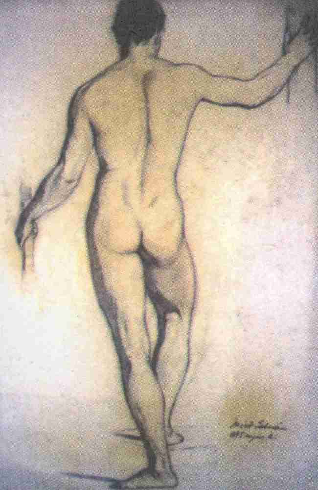 20. Mérő István: Egyik kezével rudat fogó, a másikkal támaszkodó férfiakt hátulról, 1895
