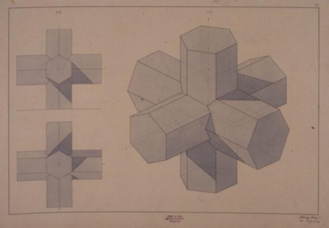 51. Irányi István: Mértani test merőleges vetületi ábrázolása és axonometrikus képe, 1911