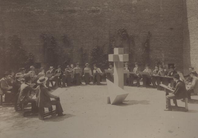 56. Szemléleti látszattani órán famodelleket rajzoló férfiak. In Fényképalbum, 1900.