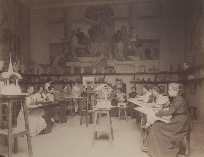 60. Szemléleti látszattani órán famodelleket rajzoló nők. In Fényképalbum, 1900.
