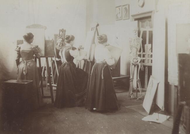 81. Csontvázat rajzoló nők. In Magyar Kir. Női Festőiskola: fényképek a növendékekről munka közben és az iskola alaprajza, j Ecole Roy. Honr. de Peinure pour Dames. Lés élevés pendan le ravail et plan de l'école, [s. n.], [Budapest], [ca. 1900]