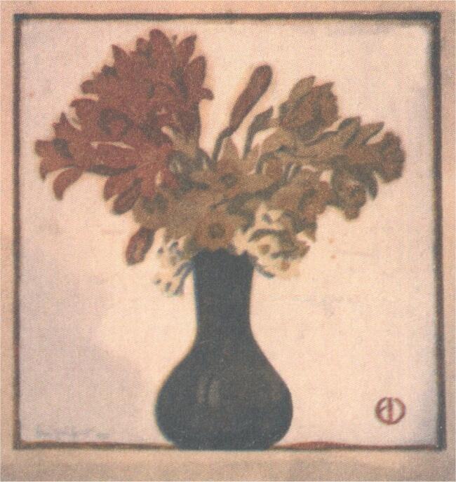 98. Edvi-Illés Jenő: Virágcsokor vázában, 1910 papír, színes linóleummetszet, 312 x 310 mm (körülvágva)