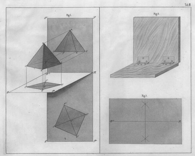 130. Gúla merőleges vetületi ábrázolása (Fig.l.) és a két képsík szemléltetése (Fig.2.). In Müller, J.: Die Constructive Zeichnungs-Lehre... Braunschweig, 1865. Tab. II.
