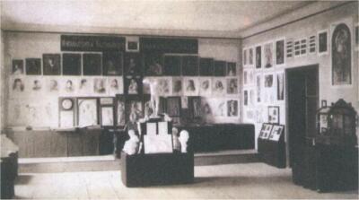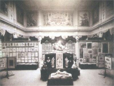 4. Fénykép: Weinwurm Antal (ifj): Az 1896. évi ezredéves kiállítás fényképe. Budapest, 1896. - Az iskola kiállítása a Közoktatási palota központi csarnokában: fent körben freskó; a középső, arabeszkes mezőben felirat: „Díszítőfestőosztály", alatta: „Művészeti és Iparművészeti oktatás". Előtérben középen a szobrászat, felirat: „Szaktanár Stróbl Alajos". A drapérián álló szobrok előtti feliratok nem olvashatók. Mögötte az Iparművészeti Iskola anyaga: alakrajzok. Balra: szabadkézi látszattan, etc. (részletfotókat lásd lennebb). Jobbra: iparművészeti rajz, etc. (részletfotókat lásd lennebb).