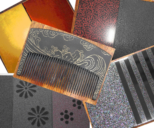 Japán lakktechnikai mintalapok I-IV és fésű lakkozása fa/japán lakk, arany, ezüst, gyöngyház 2007.