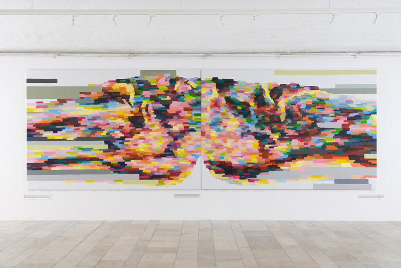 1. Machine Impressions, négycsatornás videóinstalláció, C-print papíron, 4min, loop, 2023 2. Shifting River, fa, gipszkarton, 75 festmény (akril, olaj vásznon), 2023